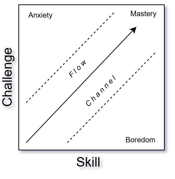 • When challenge and skill are balanced, heightened focus occurs, resulting in motivation, creative immersion, temporal distortion, and high-alignment with mastery (or a future ideal of yourself).
